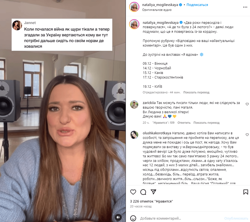 "Коли почалася війна, як щури тікали, а тепер згадали про Україну, повертаються, кому ви тут потрібні? Далі сидіть по своїх норах, де ховалися", — написала українській співачці Наталії Могилевській одна з її підписниць.