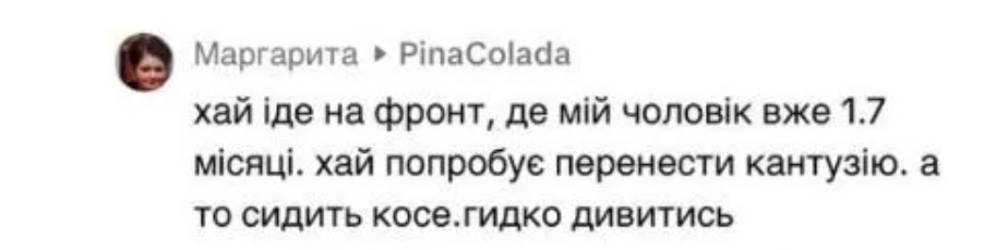 "Пусть идет на фронт, где мой муж уже 1,7 месяца, пусть попробует перенести контузию, а не сидит косит. Противно смотреть", — написала подписчица в комментариях под постом MELOVIN в TikTok.